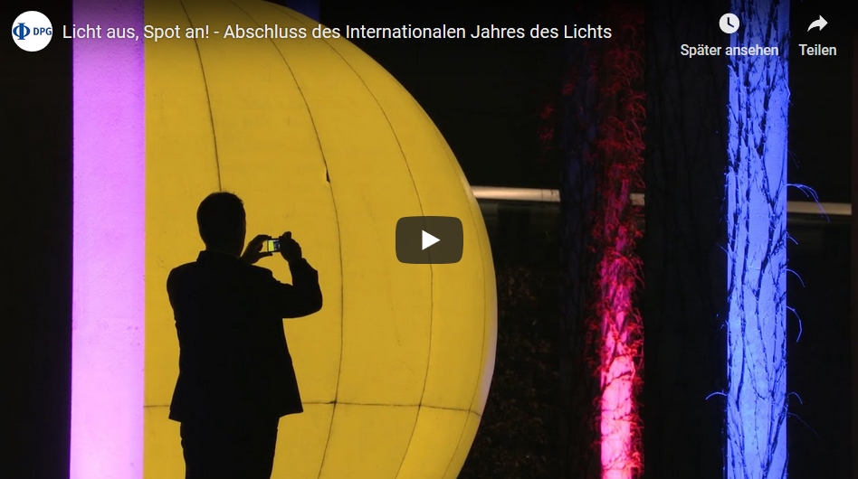 Im Rahmen des Internationalen Jahres des Lichts (IYL) lud die Deutsche Physikalische Gesellschaft (DPG) am Freitag, 9. Oktober 2015, zu einer besonderen Veranstaltung ein: Gäste aus der ganzen Welt trafen sich im Magnus-Haus Berlin, um ihre Erfahrungen zu teilen, die sie bei der Organisation des IYL in ihrem jeweiligen Land gemacht haben. Im Anschluss fand das "Lights on" des bekannten Lichterfestes vor dem Brandenburger Tor statt. Zusammen mit Verantwortlichen aus Wirtschaft und Politik drückte der Vorstand Öffentlichkeitsarbeit der DPG, Arnulf Quadt, den Startknopf. Das IYL wird in Deutschland von der DPG in Zusammenarbeit mit der Deutschen UNESCO-Kommission koordiniert.