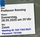Aufgrund der aktuellen Situation findet dieses Meet Your Prof online per Zoom statt. Die Zugangsdaten hierzu sind folgende: