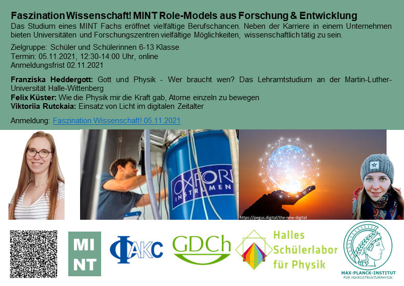 Organisiert und durchgeführt wird diese Veranstaltung vom AK Chancengleichheit der Deutschen Physikalischen Gesellschaft, der Kommission Chancengleichheit in der Chemie der Gesellschaft Deutscher Chemiker, von Halles Schülerlabor für Physik an der Martin Luther Universität Halle Wittenberg und vom Max Planck Institut für Mikrostrukturphysik in Halle. Zielgruppe: Schüler und Schülerinnen 6-13 Klasse, alle Interessierten.