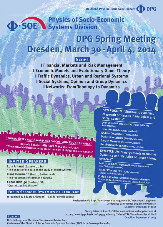 The division on "Physics of Socio-Economic Systems" (Φ·SOE, previously AKSOE/AGSOE) is committed to support the scientific exchange between the scientific disciplines involved. It has currently more than 300 members and organizes a spring conference with typically 70-100 contributions each year. During this conference, it features outstanding international speakers not only from socio- and econo-physics, but also from sociology and economics. Furthermore, scientists are awareded for outstanding innovative work in this field.