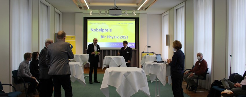 Am 05.10.2021 wurde im Magnus-Haus Berlin die Bekanntgabe der Preisträger des diesjährigen Physik-Nobelpreises live übertragen. Vonseiten der jDPG waren Hannes Vogel (jDPG-Bundesvorsitz 2018-2019) und Pauleo Nimtz (Regionalgruppe Potsdam) anwesend. Das Rahmenprogramm der Veranstaltung bildeten Interviews mit Lutz Schröter, dem amtierenden DPG-Präsidenten, sowie online zugeschalteten Expert:innen zu den einzelnen Fachgebieten. Auch die Presse verfolgte das Ereignis.