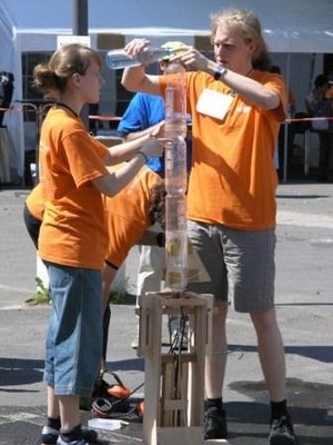 In der Wettbewerbskategorie "Wasserrakete" gingen mehr als 100 Schülerinnen und Schüler an den Start. Im Gepäck: rund 40 selbst gezimmerte, per Druckluft und Wasser angetriebene Flugmodelle. Anja Randecker (18) und Konrad Riester (16) vom Martin-Gerbert-Gymnasium in Horb am Neckar griffen für ihren Flugkörper auf eine überdimensionale russische Bierflasche zurück. Auch wenn das Plastikgeschoss letztlich auf dem Dach eines anliegenden Gebäudes landete, zuvor hatte es die Rekordhöhe von 113 Metern erklommen und den beiden Schülern damit Platz eins gesichert. Ihr Lohn: ein 400-Euro-Mediengutschein des Internetversandhauses Amazon und ein Jahresabonnement des Webportals Wissenschaft-Online.