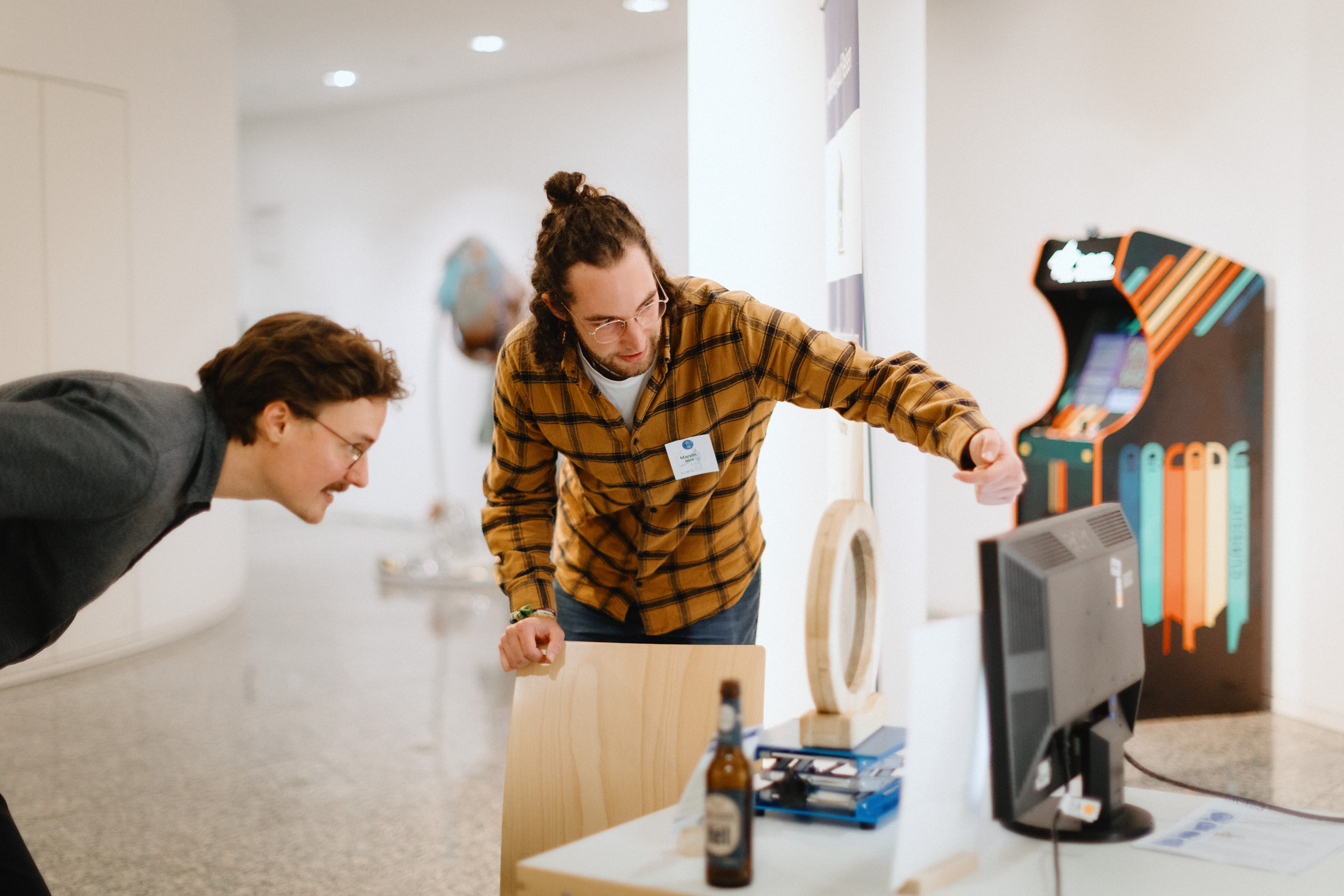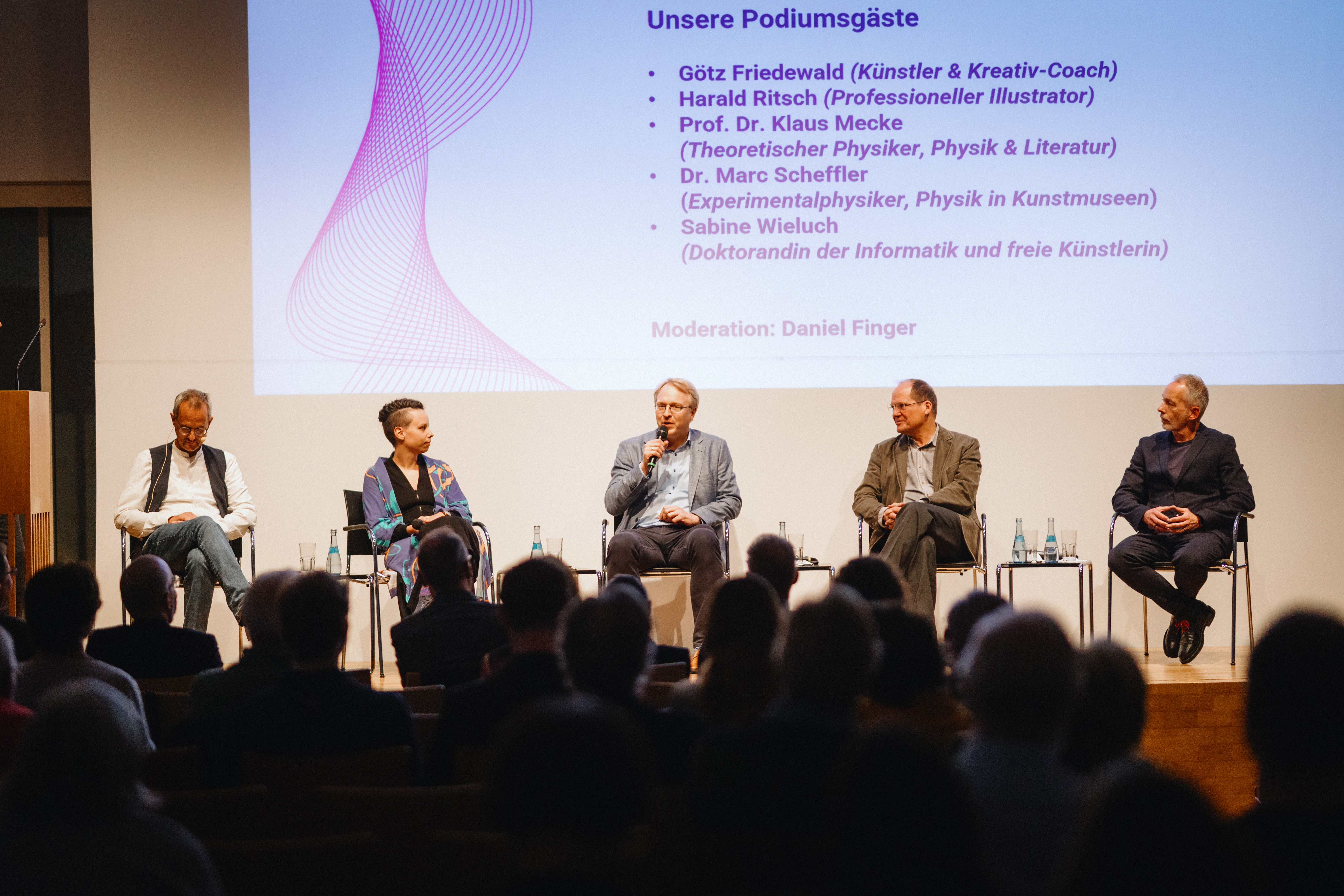 Eine Podiumsdiskussion mit Vertreter:innen aus Kunst und Wissenschaft rundete den Abend ab. Zu Gast waren Sabine Wieluch (Doktorandin der Informatik und freie Künstlerin), Dr. Marc Scheffler (Experimentalphysiker und „Physik in Kunstmuseen“), Prof. Dr. Klaus Mecke (Theoretischer Physiker, Physik & Literatur), Harald Ritsch (professioneller Illustrator) und Götz Friedewald (Künstler & Kreativ-Coach). Sie diskutierten unter anderem über die Quantenphysik in der Kunst, Kreativität in Wissenschaft und Kunst sowie die Gemeinsamkeiten und Unterschiede von Kunst und Forschung. So seien Forscher:innen und Künstler:innen immer dabei, Unbekanntes und Unerforschtes zu entdecken, sagte Sabine Wieluch. Ein Unterschied zwischen Kunst und Wissenschaft sei hingegen, dass sich Forschung immer noch im Rahmen der geltenden Naturgesetze befinden müsse, ergänzte Klaus Mecke. Sabine Wieluch, auch bekannt als bleeptrack, und Götz Friedewald sind Teil der Initiative “Quanten und Kunst in Ulm”.