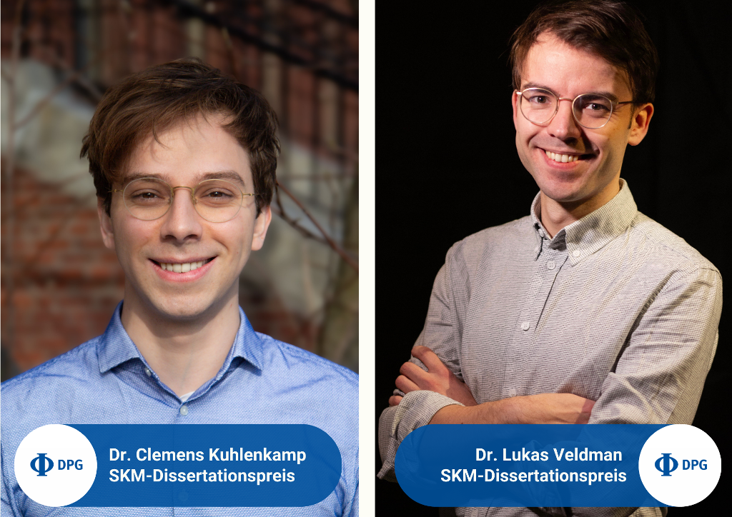 Die Sprecherin der Sektion Kondensierte Materie (SKM) Sarah Köster erläutert: „Ein besonderes Ereignis während der Tagung waren die Vorträge der diesjährigen Trägerinnen und Träger der DPG-Preise. Auch der SKM-Dissertationspreis 2025 wurde auf der Tagung in Regensburg final ausgewählt und verliehen.“ Diesen erhielten Dr. Clemens Kuhlenkamp von der Harvard University, Cambridge, USA für seine Dissertation über „Aspekte und Observablen stark korrelierter quantenmechanischer Phasen in zwei Dimensionen“ und Dr. Lukas Veldman von der TU Delft, Niederlande für seine Dissertation über „Kohärente Dynamik von Atomspins auf einer Oberfläche“.