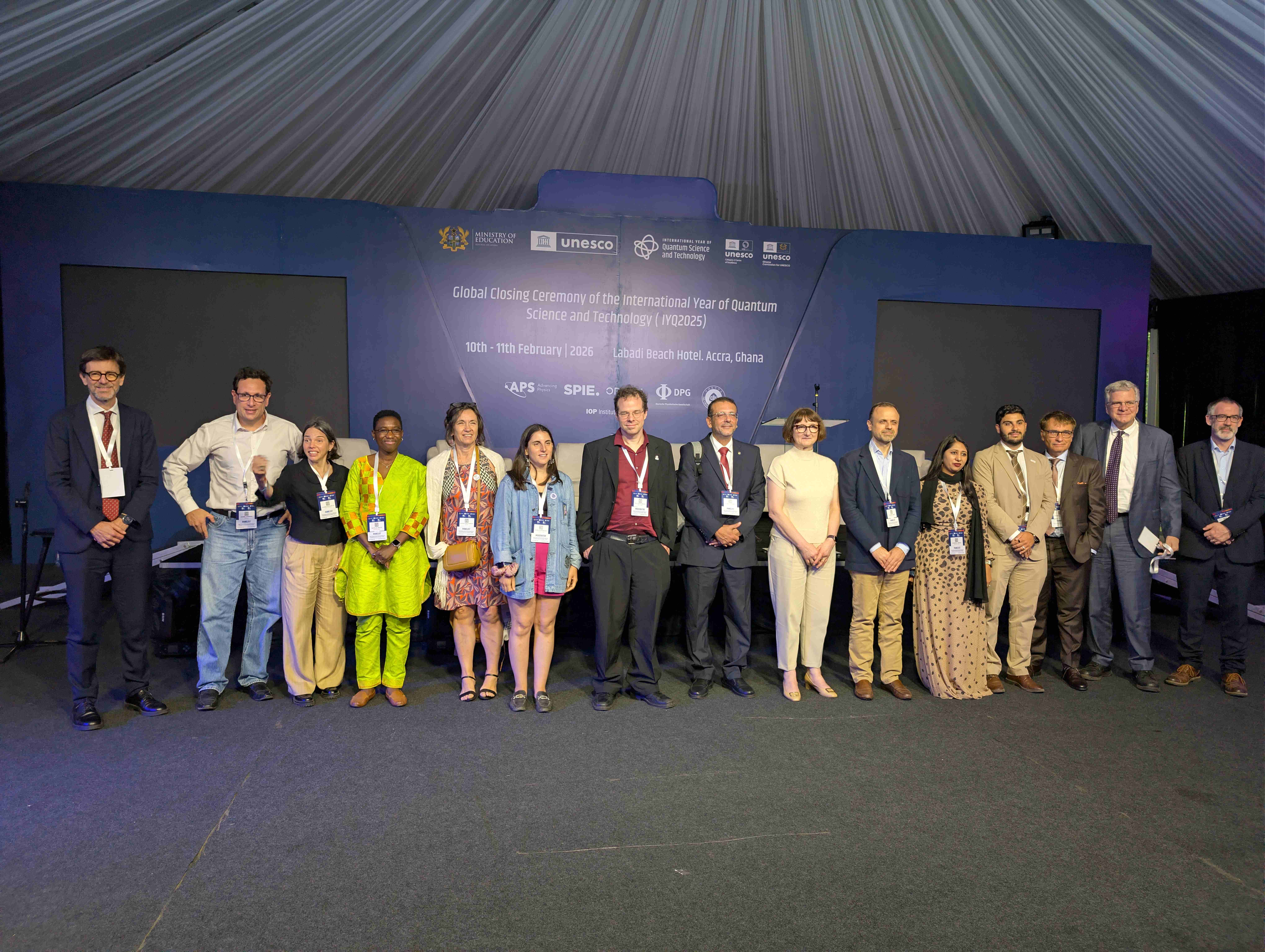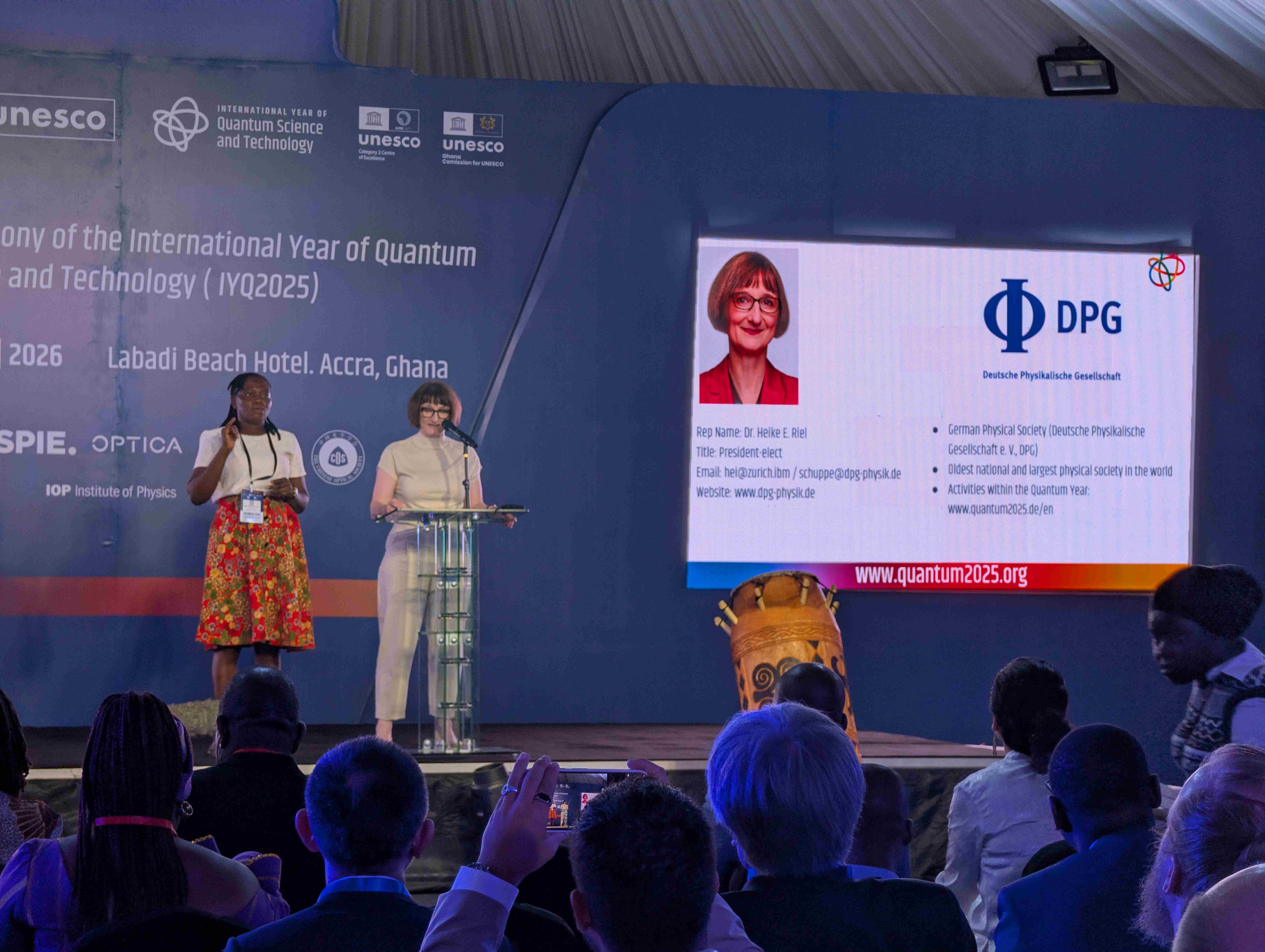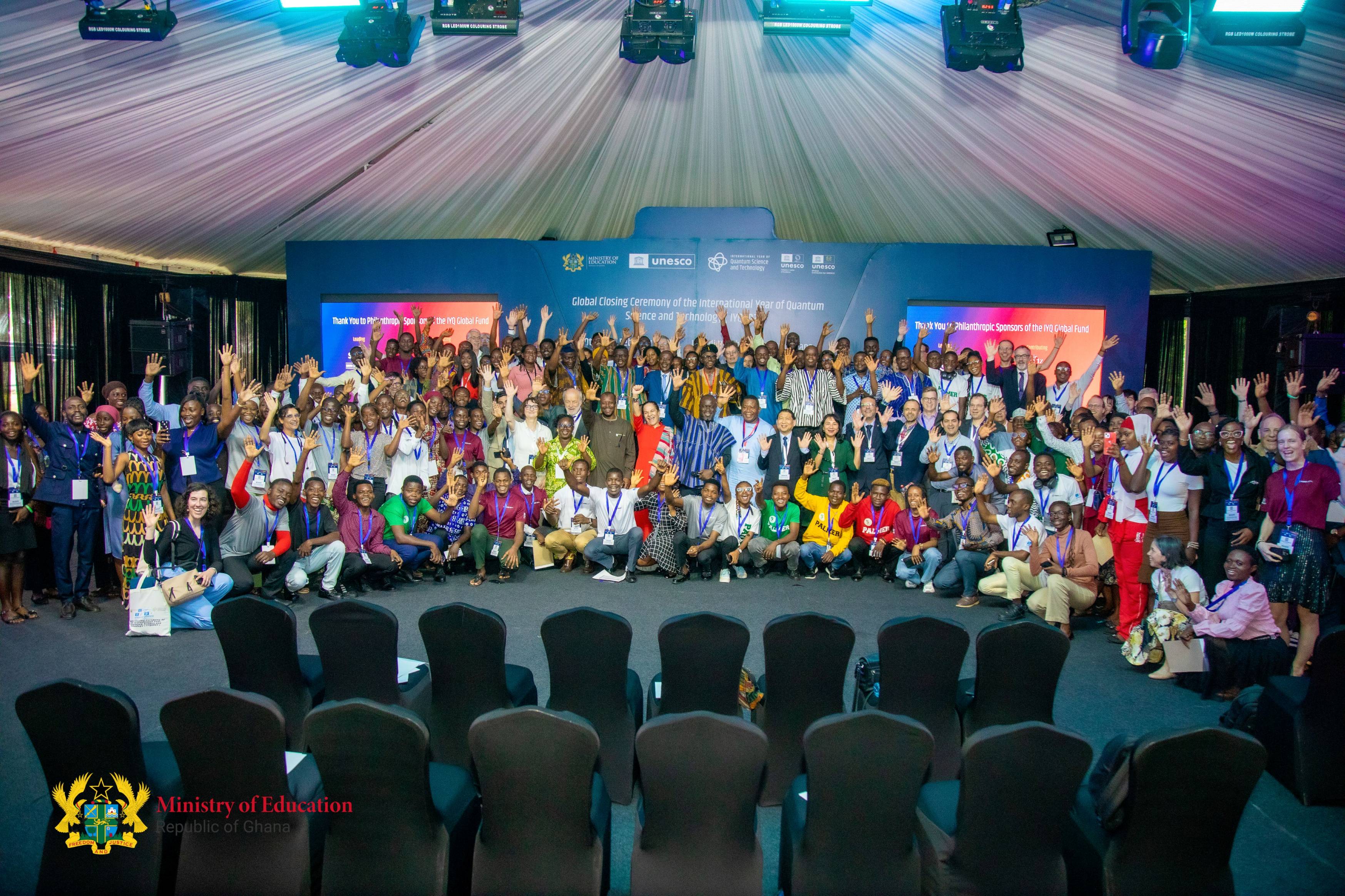 Die zweitätige Closing Ceremony begann unter anderem mit einem Grußwort des ghanaischen Bildungsministers Haruna Iddrisu und einer Reihe von Beiträgen und Podiumsdiskussionen, darunter die Vorstellung des UNESCO Global Reports und eine Diskussion über die Rolle Afrikas in der zukünftigen Quantenlandschaft. Michele Dougherty, betonte, dass das Quantenjahr noch mehr erreicht hat, als die Bedeutung der Quantenphysik nach außen zu tragen: Zu zeigen, wie wichtig internationale Zusammenarbeit in der Wissenschaft und im Allgemeinen ist. Kulturelle Elemente wie die Videopräsentation der „Quantum 100"-Persönlichkeiten und künstlerische Beiträge von ghanaischen Jugendlichen unterstrichen den internationalen und inklusiven Charakter des Events. In ihrer Abschlussrede betonte Heike Riel, designierte Präsidentin der Deutschen Physikalischen Gesellschaft: „Den Abschluss des Internationalen Jahres der Quantenwissenschaft sehe ich als eine Mission an: Die treibende Kraft des Jahres der Quantenwissenschaft soll weiterhin als Katalysator wirken, um die internationale wissenschaftliche Zusammenarbeit aufrechtzuerhalten und weiter zu stärken und das Verständnis und die Begeisterung für die Physik zu fördern – zum Wohle der Physik und des menschlichen Fortschritts!“