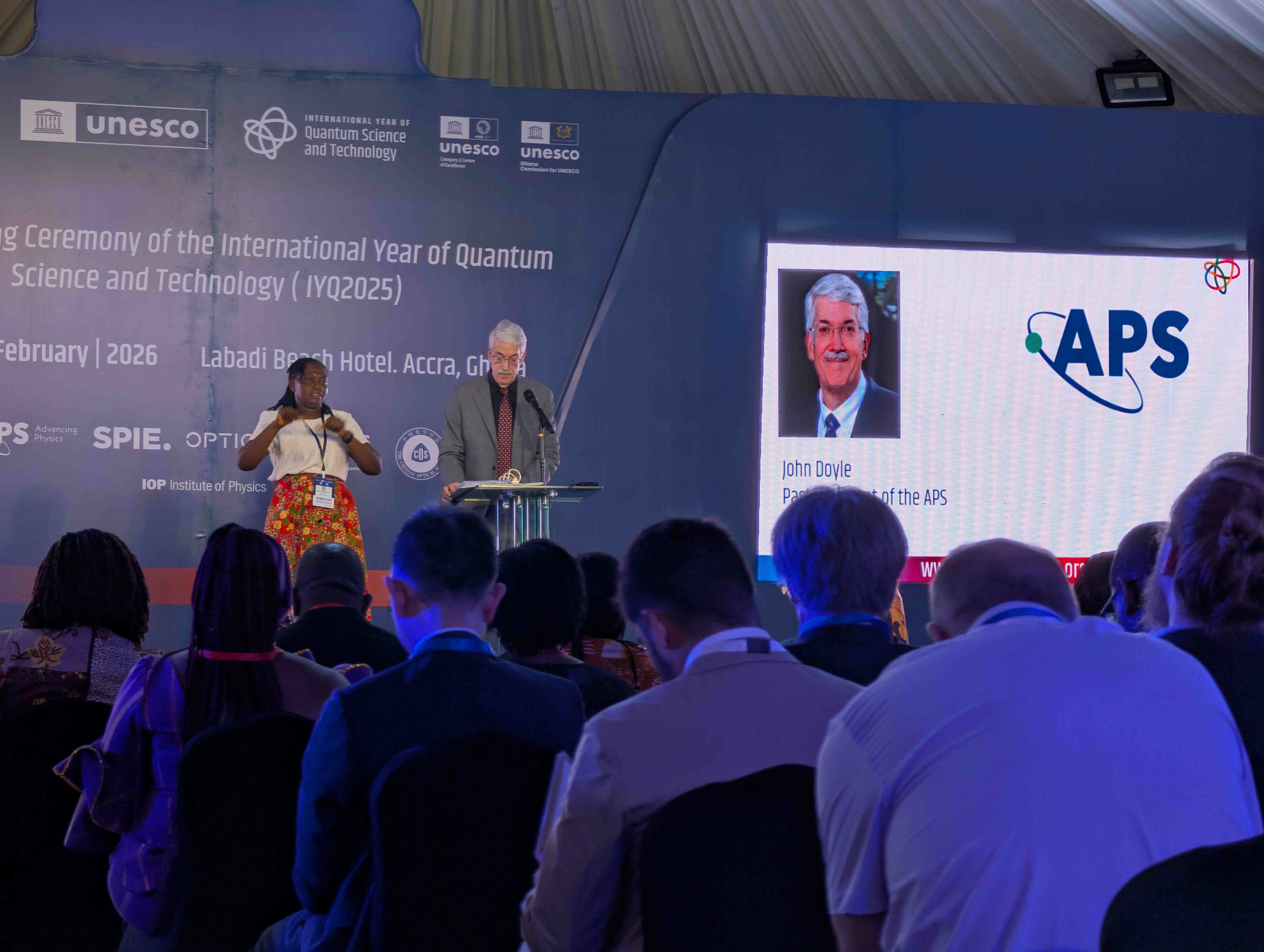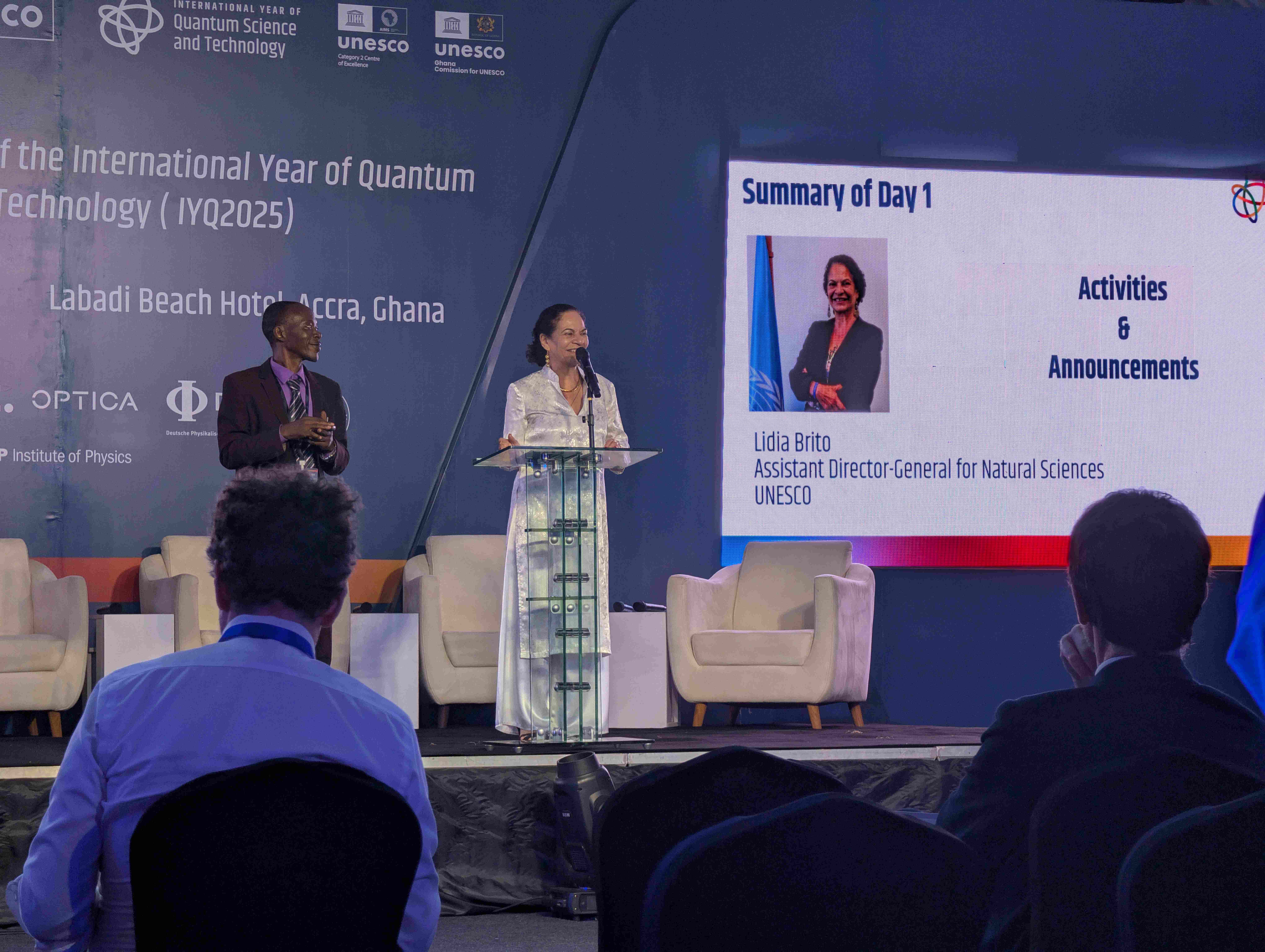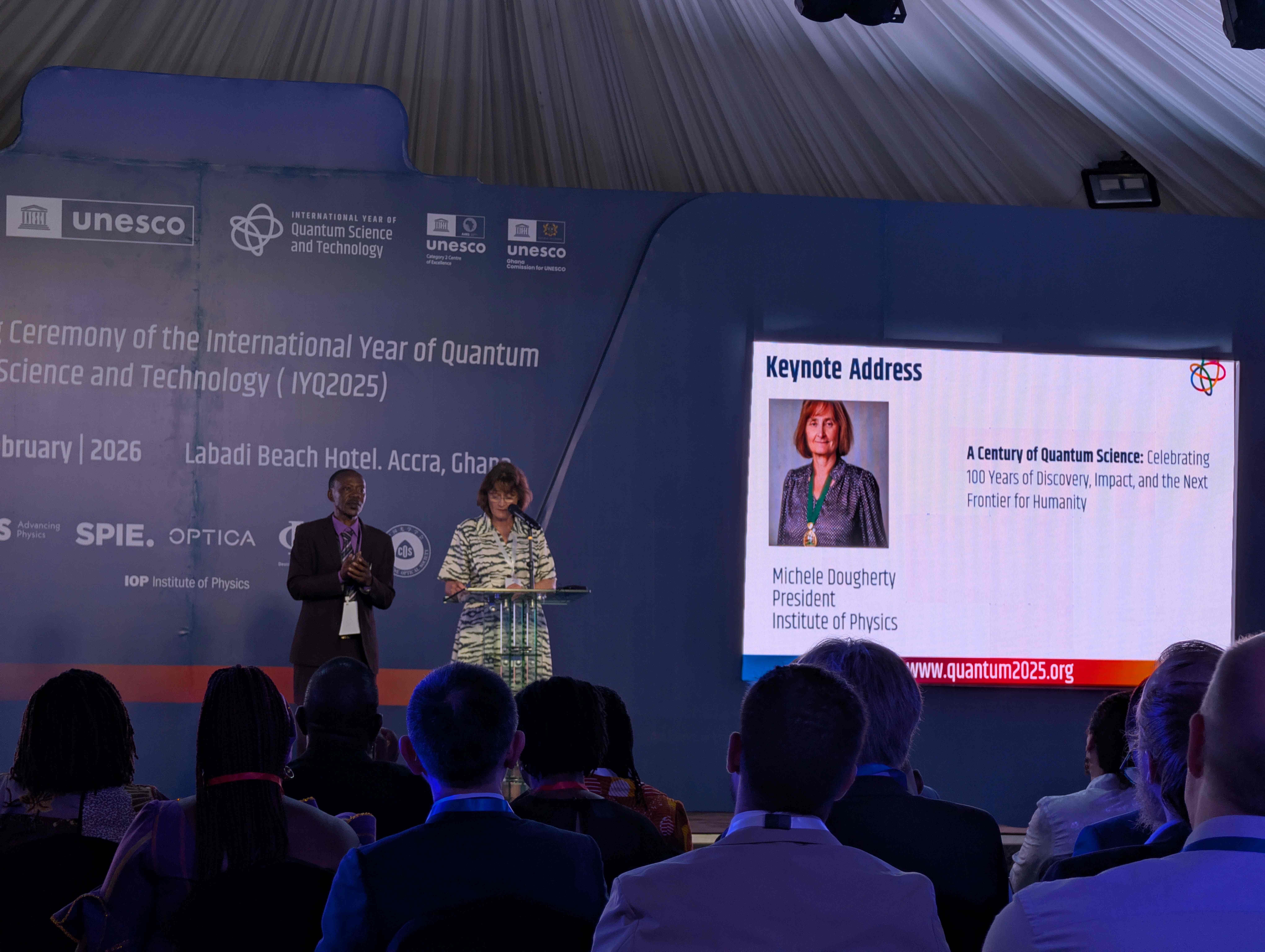 Die zweitätige Closing Ceremony begann unter anderem mit einem Grußwort des ghanaischen Bildungsministers Haruna Iddrisu und einer Reihe von Beiträgen und Podiumsdiskussionen, darunter die Vorstellung des UNESCO Global Reports und eine Diskussion über die Rolle Afrikas in der zukünftigen Quantenlandschaft. Michele Dougherty, betonte, dass das Quantenjahr noch mehr erreicht hat, als die Bedeutung der Quantenphysik nach außen zu tragen: Zu zeigen, wie wichtig internationale Zusammenarbeit in der Wissenschaft und im Allgemeinen ist. Kulturelle Elemente wie die Videopräsentation der „Quantum 100"-Persönlichkeiten und künstlerische Beiträge von ghanaischen Jugendlichen unterstrichen den internationalen und inklusiven Charakter des Events. In ihrer Abschlussrede betonte Heike Riel, designierte Präsidentin der Deutschen Physikalischen Gesellschaft: „Den Abschluss des Internationalen Jahres der Quantenwissenschaft sehe ich als eine Mission an: Die treibende Kraft des Jahres der Quantenwissenschaft soll weiterhin als Katalysator wirken, um die internationale wissenschaftliche Zusammenarbeit aufrechtzuerhalten und weiter zu stärken und das Verständnis und die Begeisterung für die Physik zu fördern – zum Wohle der Physik und des menschlichen Fortschritts!“