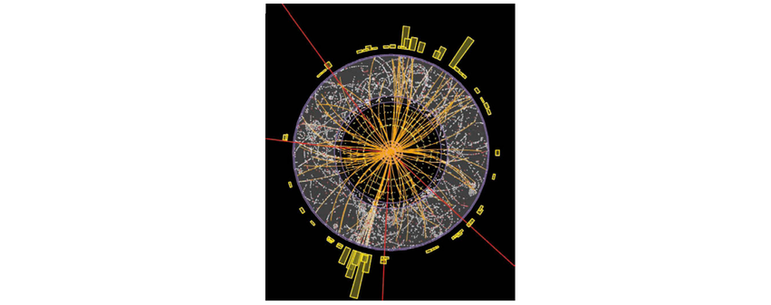 Wie weist man das Higgs-Teilchen nach? Um Higgs-Teilchen zu erzeugen, werden im Large Hadron Collider (LHC) am CERN Protonen mit vorher nie erreichten Energien von 4.000 GeV [1] zur Kollision gebracht. In einer Minute finden Milliarden von Reaktionen statt, bei denen meist nur ein einziges Mal ein Higgs-Teilchen produziert wird. Dieses zerfällt in kürzester Zeit und kann daher nur über seine Zerfallsprodukte identifiziert werden, wie z. B. den Zerfall in zwei Z-Bosonen. Die wiederum können in je zwei Myonen zerfallen, die schweren Partner des Elektrons. Ein solches Zerfallsereignis ist in der Abbildung dargestellt.