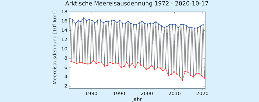 In diesem Jahr wurde Mitte September mit 3,8 Millionen km² nach dem Jahr 2012 die zweitniedrigste Meereisausdehnung seit Beginn der Satellitenbeobachtungen in den 1970ern gemessen (Abb. 2). Bis Mitte des Jahrhunderts ist damit zu rechnen, dass die Sommermeereisausdehnung unter eine Million km² fällt, was im Rahmen der Klimamodellierung als „eisfrei“ definiert ist [2].