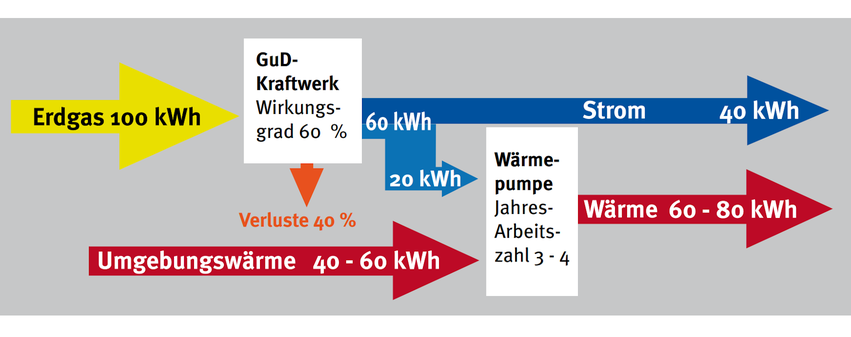 Für einen Vergleich mit erdgasbetriebener KWK muss bei der Wärmepumpe auch die Stromerzeugung mit dem gleichen Brennstoff berücksichtigt werden, d. h. mittels GuD-Kraftwerken, die aus einer Gasturbine mit nachgeschaltetem Dampfkraftwerk bestehen. Ein großes GuD arbeitet thermodynamisch erheblich günstiger als mehrere kleine BHKWs mit gleicher elektrischer Leistung. Aus 100 kWh Erdgasenergie erzeugen GuDs 60 kWh Strom (Abb. 1b). Das sind 20 kWh mehr als BHKWs bei der KWK liefern. Mit diesem zusätzlichen Strom stellen Wärmepumpen das Drei- bis Vierfache, also 60 bis 80 kWh als nutzbare Wärme zur Verfügung. Insgesamt erhält man so 100 bis 120 % der eingesetzten Erdgasenergie gegenüber maximal 90 % bei der KWK.