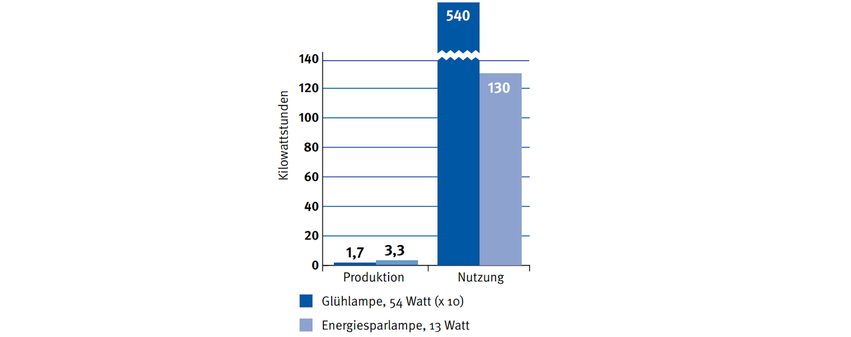 Ökobilanz über die gesamte Lebensdauer (Modellrechnung) Über 90 Prozent der Umweltbelastungen durch Lampen fallen während ihrer Nutzung an [11, 12]. Die Auswirkungen durch Produktion, Transport und Entsorgung sind zwar vergleichsweise gering, in den folgenden Diagrammen dennoch teilweise aufgeführt. Gegenübergestellt werden eine langlebige Energiesparlampe und 10 Glühlampen, weil eine Energiesparlampe aufgrund ihrer Lebensdauer (hier wurden 10.000 Stunden angenommen), je nach Modell, faktisch mehrere Glühlampen ersetzt – in der Weise, dass letztlich die gleiche Lichtmenge abgegeben wird [15].